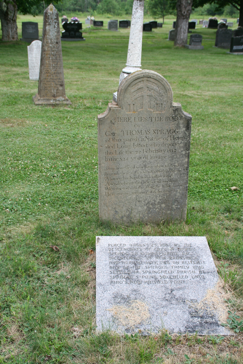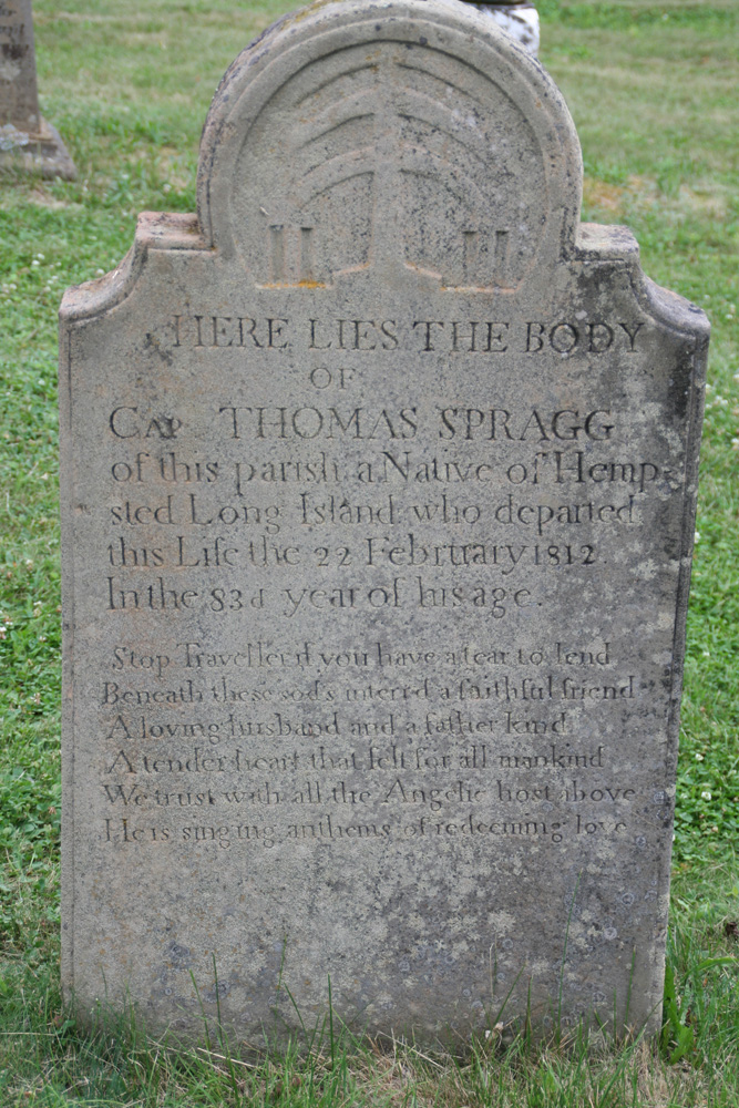 OF CAP THOMAS SPRAGG of this parish a Native of Hemp- stead Long Island who departed this life 22 February 1812. In the 83rd year of his age.